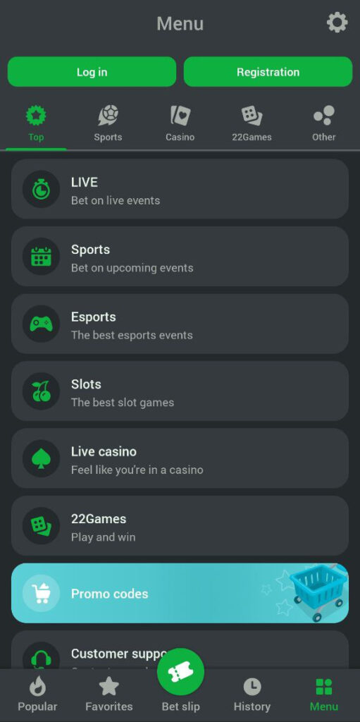 For me, one of the advantages of application 22bet was its clear design, which makes it much easier to get acquainted and play later. The interface is in calm green and white colours, which does not irritate the eyes even with prolonged use. The main menu is conveniently located, providing easy access to sporting events, casino, promotions and the account management section.
