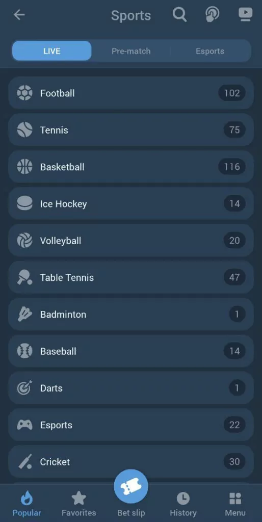 The live betting feature allows you to predict events in real time. Odds are updated without delay, and many matches have inbuilt video broadcasts. This applies to football, tennis, cricket, CS:GO, Valorant and other games.