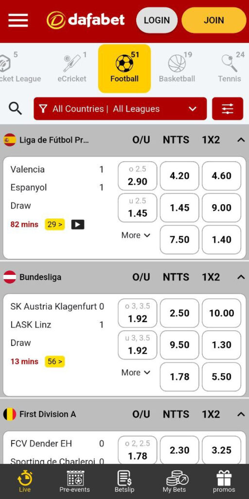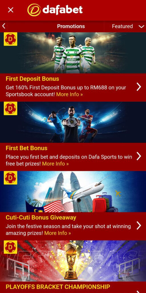 The Dafabet app interface is perfectly optimised for handheld devices with any screen size. It is built on the principle of modular navigation with an emphasis on speed and ergonomics. The design is based on a dark red colour scheme with yellow and white elements for instant orientation in options and services. On the main panel at the bottom are the main categories: Live, Pre-events, Betslip, My Bets and Promos – all accessible in one click and without scrolling.